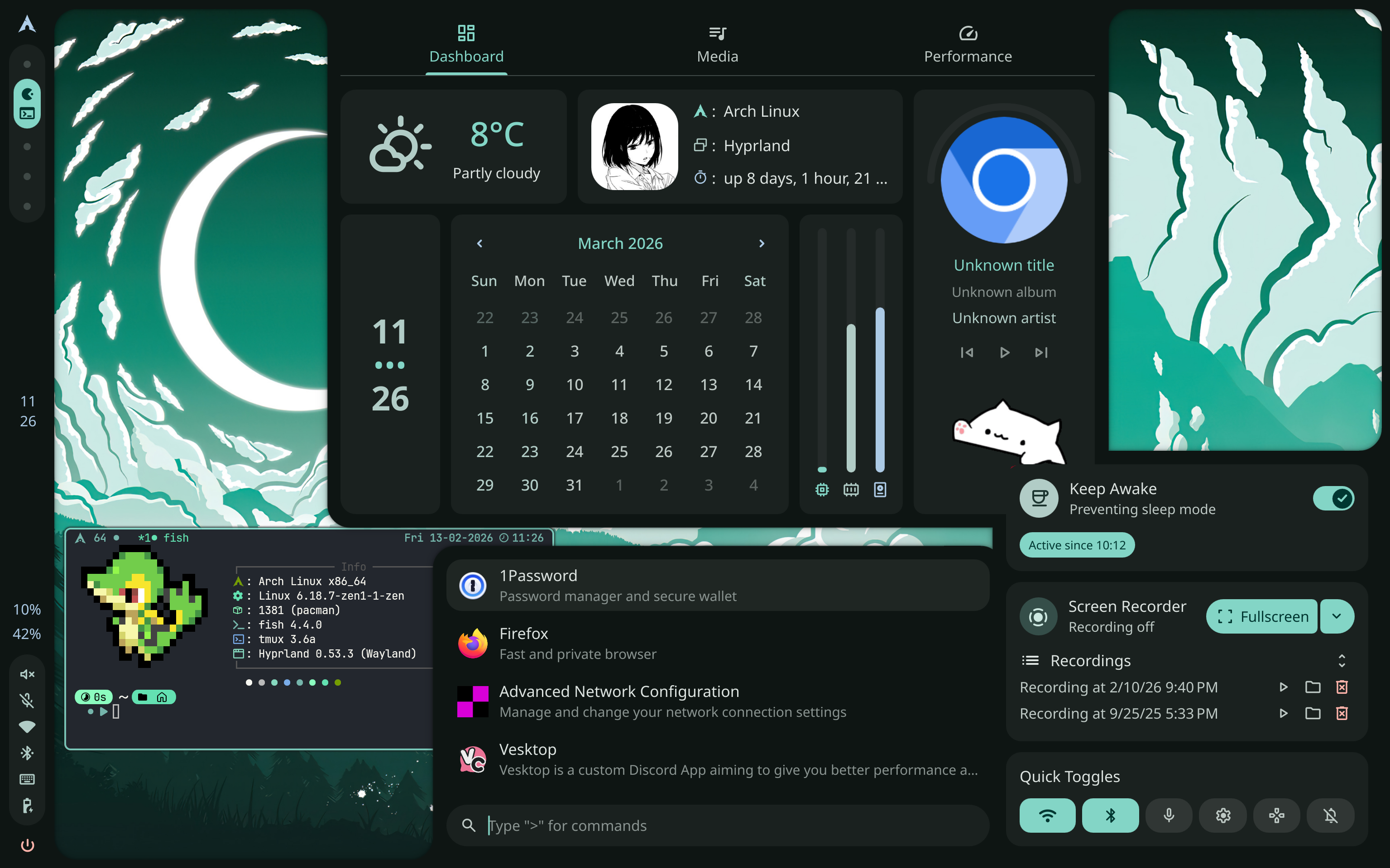 Feature-rich QML desktop shell for Hyprland with dashboard, launcher, media controls, and system monitoring